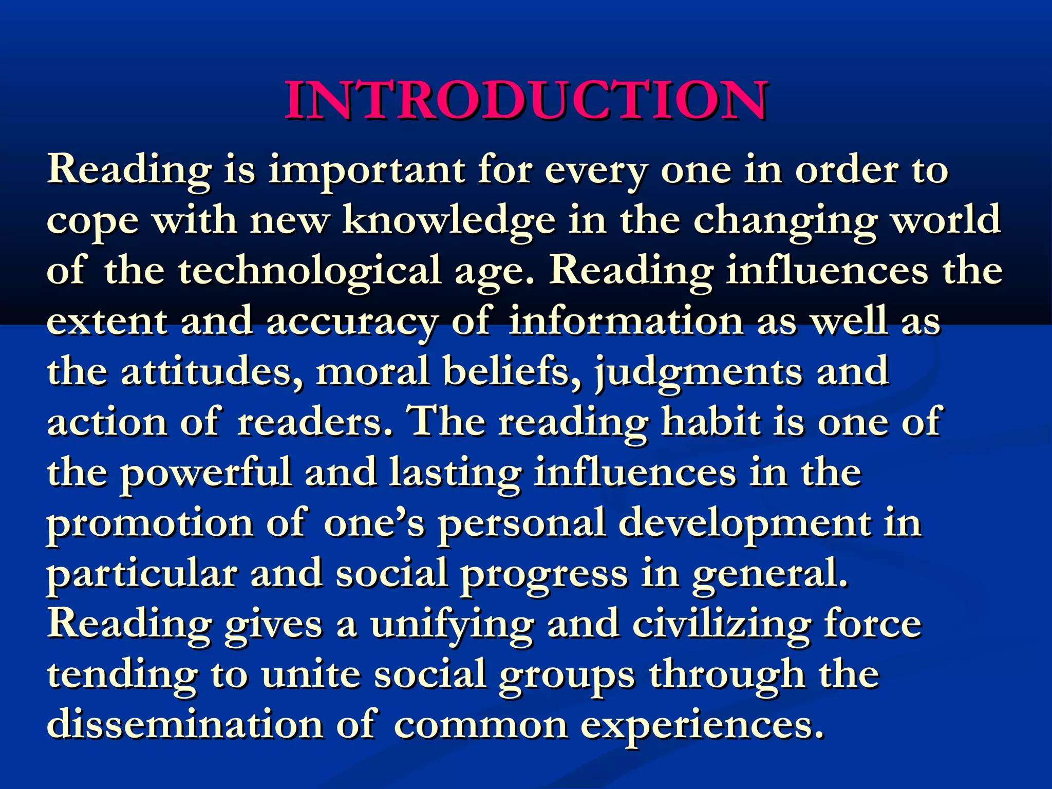 iimmppoorrttaanntt ffoorr eevveerryy oonnee iinn oorrddeerr ttoo ccooppee wwiitthh nneeww kknnoowwlleeddggee iinn tthhee cchhaannggiinngg wwoorrlldd ooff tthhee tteecchhnnoollooggiiccaall aaggee.. RReeaaddiinngg iinnfflluueenncceess tthhee eexxtteenntt aanndd aaccccuurraaccyy ooff iinnffoorrmmaattiioonn aass wweellll aass tthhee aattttiittuuddeess,, mmoorraall bbeelliieeffss,, jjuuddggmmeennttss aanndd aaccttiioonn ooff rreeaaddeerrss.. TThhee rreeaaddiinngg hhaabbiitt iiss oonnee ooff tthhee ppoowweerrffuull aanndd llaassttiinngg iinnfflluueenncceess iinn tthhee pprroommoottiioonn ooff oonnee’’ss ppeerrssoonnaall ddeevveellooppmmeenntt iinn ppaarrttiiccuullaarr aanndd ssoocciiaall pprrooggrreessss iinn ggeenneerraall.. RReeaaddiinngg ggiivveess aa uunniiffyyiinngg aanndd cciivviilliizziinngg ffoorrccee tteennddiinngg ttoo uunniittee ssoocciiaall ggrroouuppss tthhrroouugghh tthhee ddiisssseemmiinnaattiioonn ooff ccoommmmoonn eexxppeerriieenncceess..