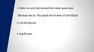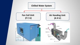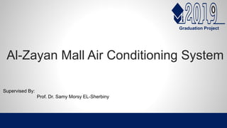 This document summarizes the design of an air conditioning system for Al-Zayan Mall in Alexandria, Egypt. The mall has 3 basement floors, 4 floors of retail space, and 6 floors of administrative offices. The design involves calculating the cooling load using the HAP program, selecting appropriate air handling units and fan coil units from manufacturer catalogs based on the load results, and designing ductwork using the equal friction method. Key components of the chilled water system are also described, including water chillers, cooling towers, pumps, and the water distribution system. Duct material, thickness, insulation, installation and testing are discussed.