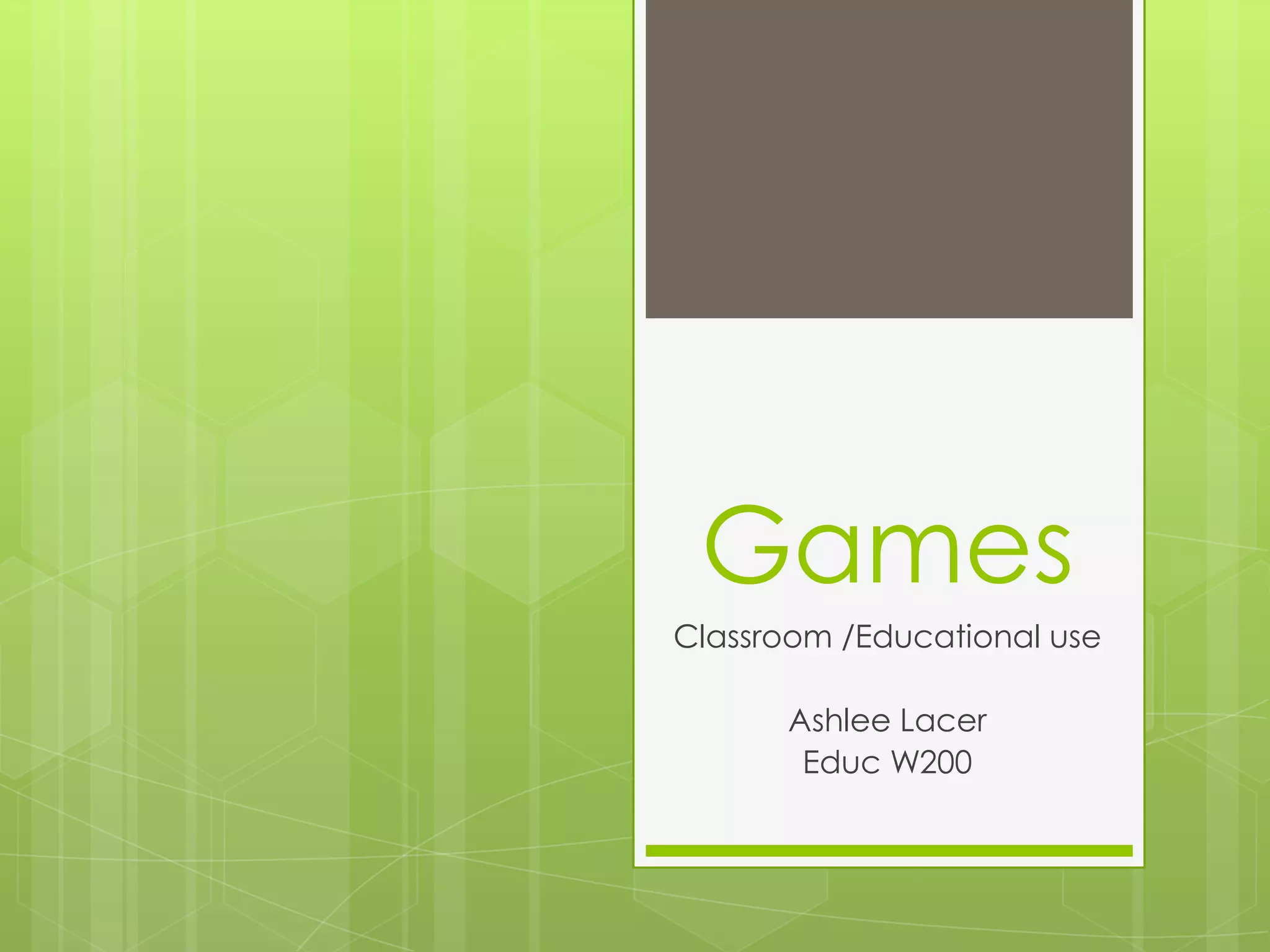 This document discusses the educational benefits of introducing games into the classroom. It summarizes three resources that support using games for learning: The Education Arcade creates games based on classroom lessons to motivate students; an article found students felt more engaged and retained information better when lessons included games; and FunBrain.com is an educational gaming site that helps students practice skills in a fun, interactive way across various subjects. The document concludes games can help students get involved in learning and help them meet educational goals.