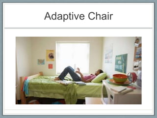 The document summarizes the development of an adaptive chair for students. It describes conducting a questionnaire to understand student needs, creating mock-ups of potential features like height adjustment and reclining, and using ideas from Mercedes car seats like heated seating and adjustable lumbar support. The final chair design includes adaptive seat heating, cushioning to sense posture, and a feature to sense body tension and automatically switch between study and break modes.