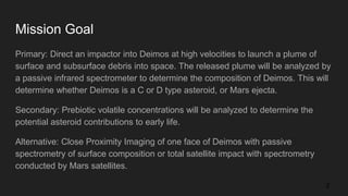 The ADIOS mission aims to direct an impactor into Deimos to create a plume for analysis of its surface and subsurface composition, with a focus on identifying its origins and potential contributions to early life. The mission requires a successful collision at a speed of 3.5 km/s, and aims to relay spectrometer data back to Earth for further analysis. The project's budget is approximately $3.8 million, and it includes a range of scientific objectives related to Deimos' composition and its relation to Mars.