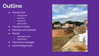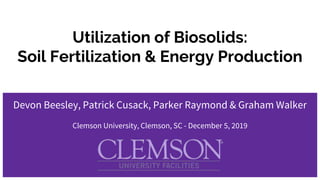 This document outlines a student capstone project to utilize biosolids from Clemson University's wastewater treatment plant. It provides background on biosolids and their potential uses for land application and gasification. The objectives are to design a viable pathway for biosolids use and select the optimal approach. Literature on the relevant regulations, processes, and constraints for land application and gasification is reviewed to inform the project tasks of evaluating and selecting the best utilization method.