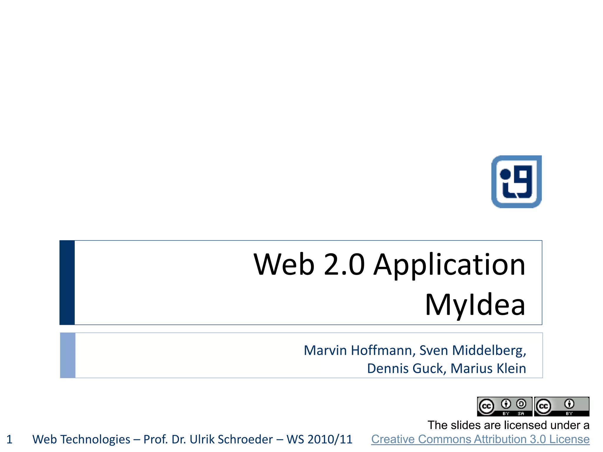 This document summarizes a web 2.0 application called "MyIdea". It uses various web technologies including HTML, CSS, JavaScript, Jquery, Ajax, REST, XML, CakePHP, MySQL, and the Facebook API. Special features of MyIdea include profile pages to browse and list ideas and upload pictures, friendships with adding and approving friends, and managing ideas by creating, viewing, editing, categorizing, commenting on, and uploading multiple pictures for ideas.
