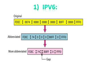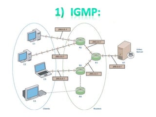 This document provides an overview of the network layer and some of its key protocols. It begins with an introduction to the network layer and its main responsibilities, including routing packets between subnets that may have different addressing schemes or protocols. It then discusses some of the network layer's main functionalities and features. The remainder of the document defines and describes several important network layer protocols, including EIGRP, ICMP, IGMP, IPv4, and others. It provides high-level explanations of how these protocols function and their roles within the network layer.