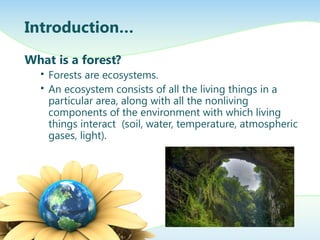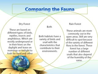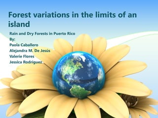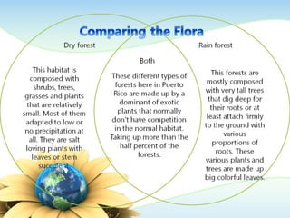 This document summarizes two major forest types in Puerto Rico - the El Yunque rainforest and the Guánica dry forest. It describes key differences in climate, flora, and fauna between the two forests. It also discusses threats they face from human activities like tourism, fires, and contamination, and their economic importance for tourism.