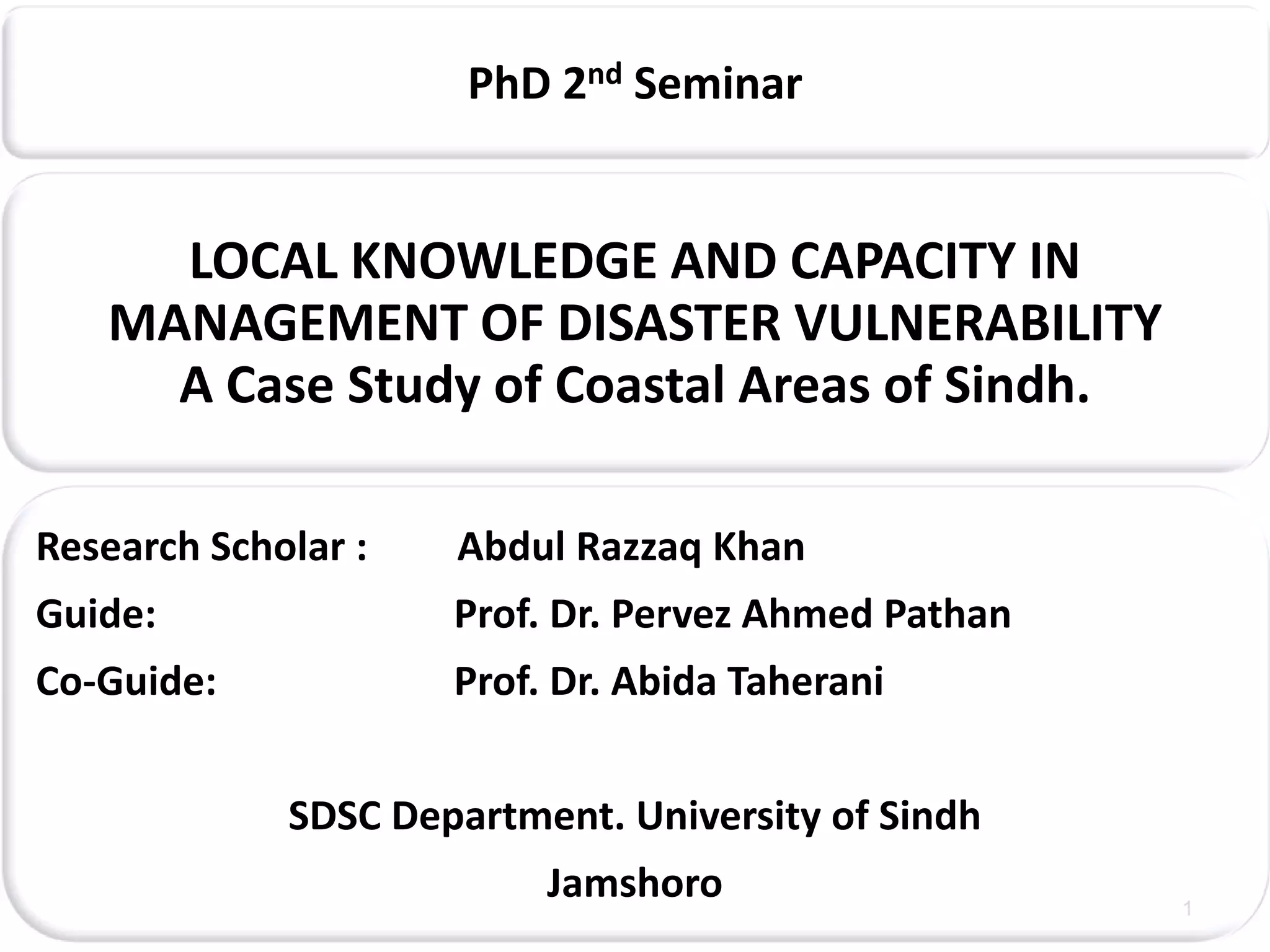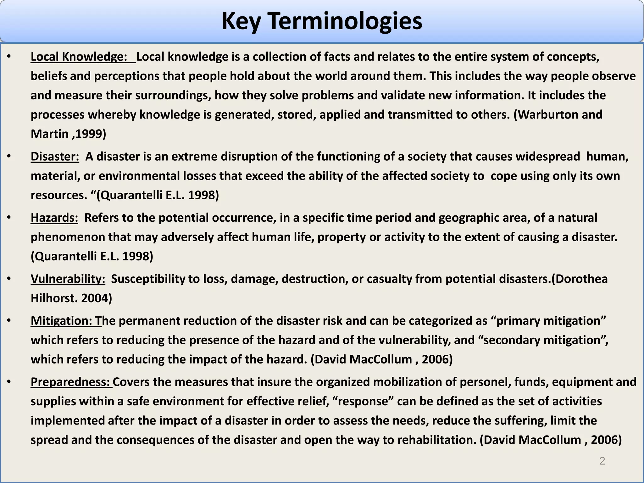 Local knowledge refers to the facts, beliefs, and perceptions people hold about their surroundings. This includes how they observe and solve problems. A disaster is a disruption that exceeds a society's ability to cope using its own resources. Hazards refer to natural phenomena that may adversely affect life or property. Vulnerability is susceptibility to loss from potential disasters. Mitigation permanently reduces disaster risk through reducing hazards and vulnerability. Preparedness ensures organization and resources for relief response after a disaster impact. The document then provides figures and sources related to disasters in coastal areas of Sindh province in Pakistan.