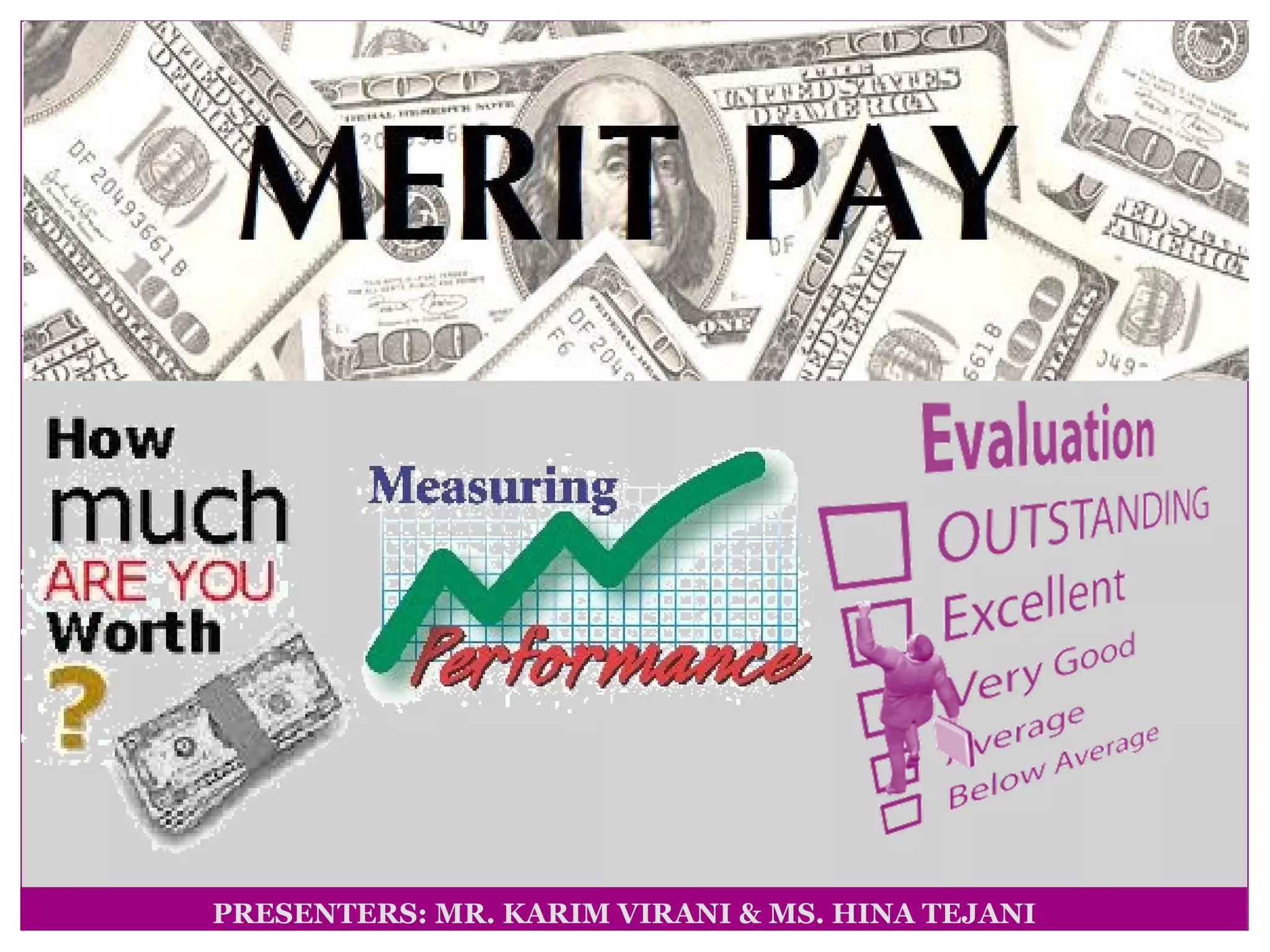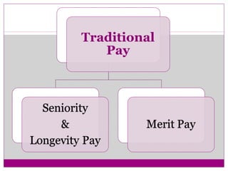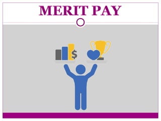This document discusses traditional pay systems, merit pay systems, and effective performance appraisal plans for merit pay. It describes how merit pay ties compensation to performance evaluations using objective and subjective metrics. An effective merit pay program requires non-discriminatory performance appraisals that limit biases, establish clear job standards, and differentiate pay based on achievement of goals. However, merit pay programs can fail if they do not accurately measure and reward performance or if other factors influence compensation decisions.
