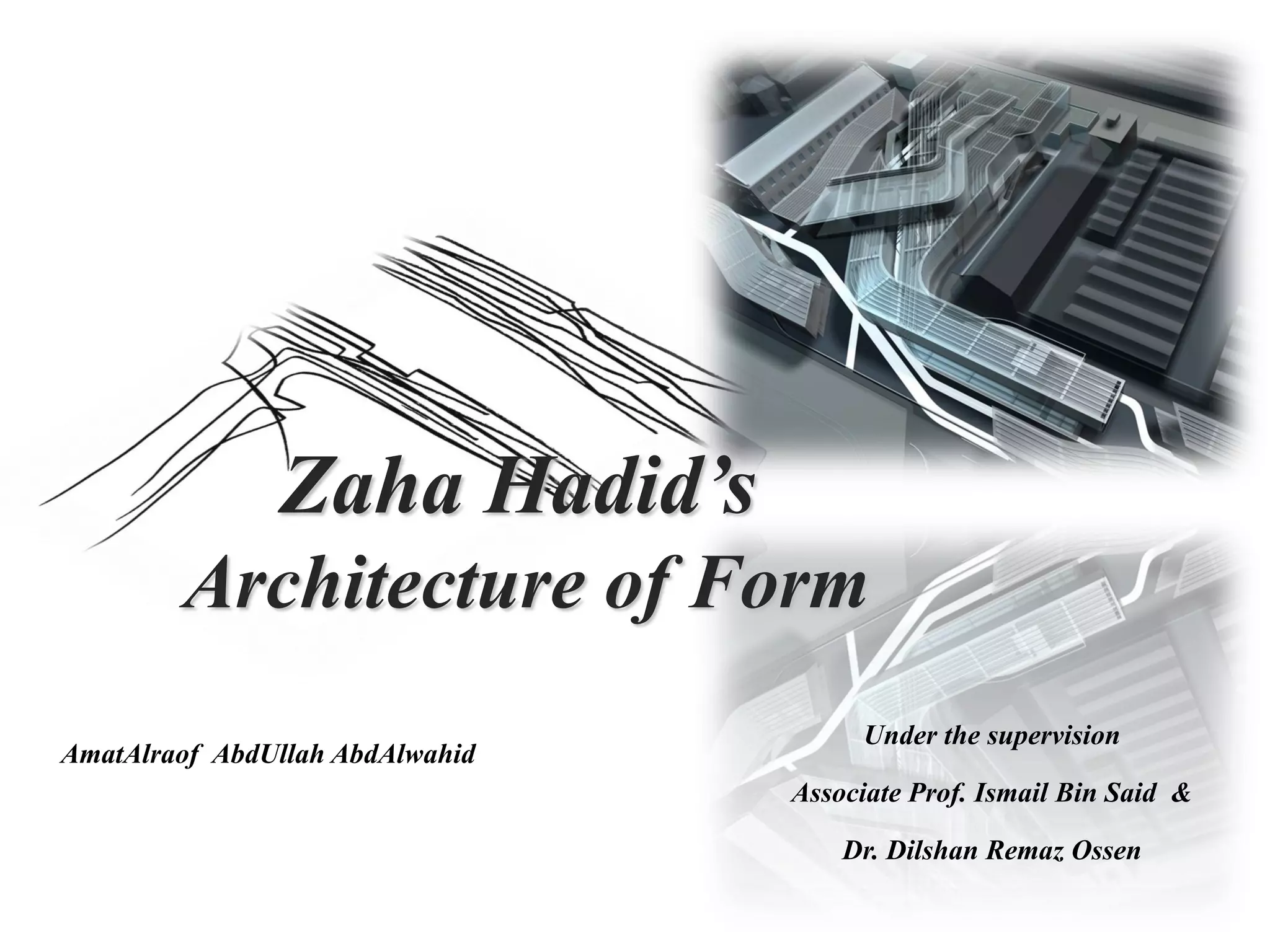 Zaha Hadid is known for her imaginative and radical architecture. This study examines Hadid's strategy of design and techniques for developing unique architectural forms. The study analyzes over 200 of Hadid's projects through content analysis of interviews and documentation. Key findings include that Hadid's strategy involves intensive research considering site conditions, functions, circulation, and context. She applies techniques like manipulating plans and elevations to reflect interior spaces. The study categorizes Hadid's works into patterns based on prevailing form characteristics to understand her approach to design.