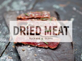 Tuck Kee Dried Meat was founded in the 1980s in Penang, Malaysia by Chong Man Tuck. It operates from 9AM to 10PM and specializes in pork dried meat, seasoned dried foods, and minced chicken dried meat. Loong Kee, Oloiya, and Bah Kuah Eng are its top three competitors in Penang. Oloiya was founded in the 1970s and has two outlets in Penang Island and Butterworth selling popular products like chicken dried meat.