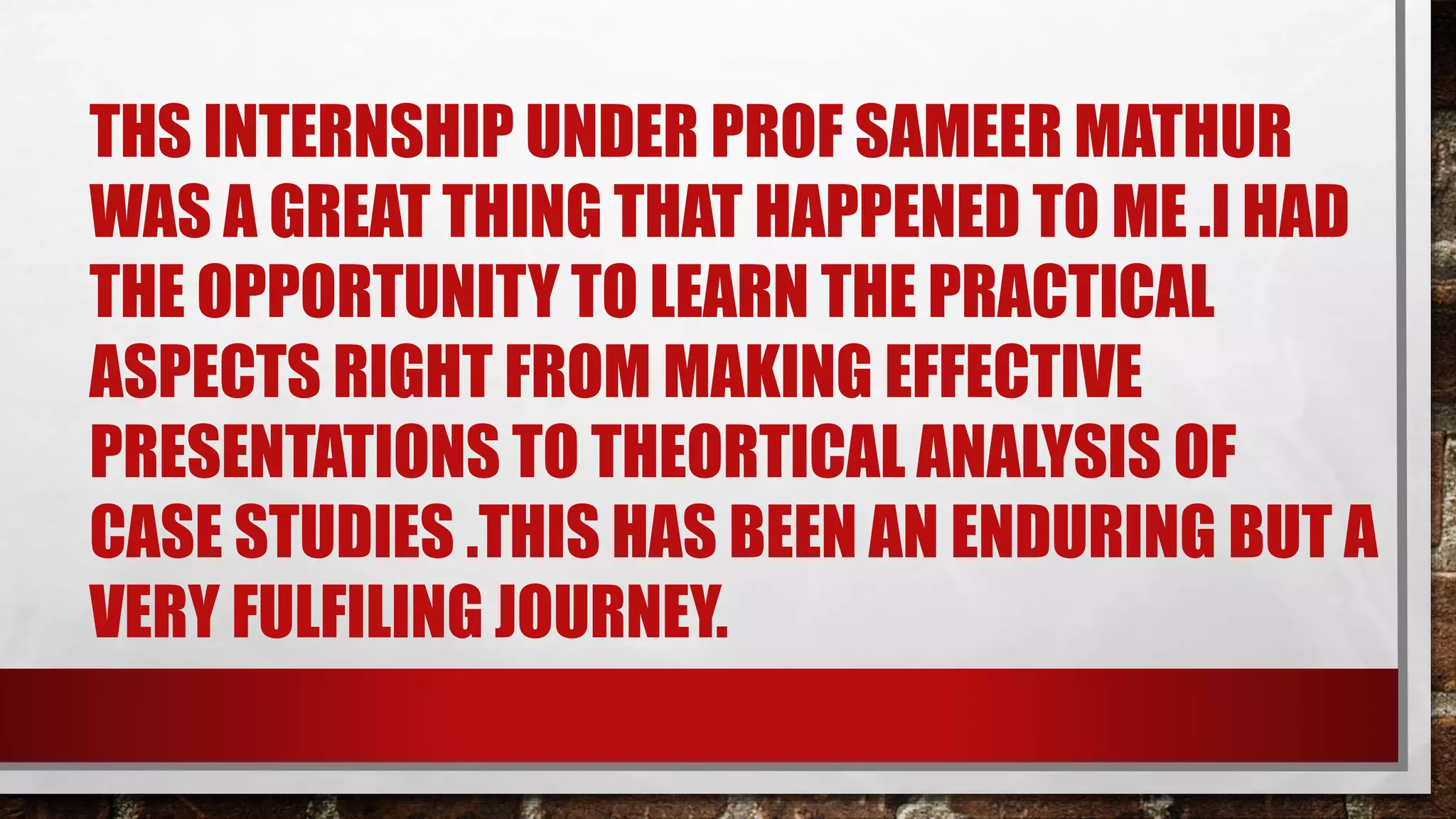 The document recounts an enriching internship experience under Professor Sameer Mathur, focusing on practical skills such as presentation making and marketing management. It highlights notable companies like Meru Cabs and Virgin Atlantic, emphasizing their innovative marketing strategies and effective use of social media. Key takeaways include the importance of delivering a clear customer promise and building trust through communication.