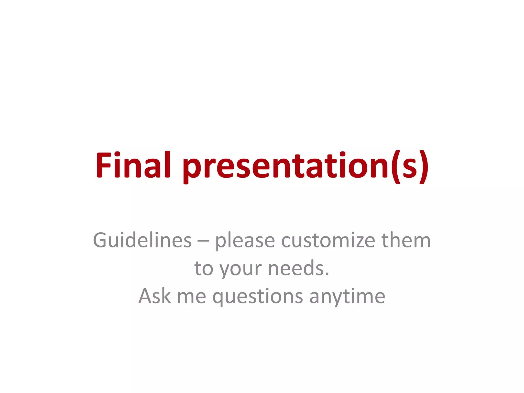The document provides guidelines for final presentations including: 1. The purpose is to show the work done this semester using the user-centered design process and present usability testing findings. 2. Presentations should tell the story of the work in an engaging way without getting lost in details, and persuade the audience the product is worth investing in. 3. Advice is given to use a problem-solution format, establish credibility, and end with a call to action.