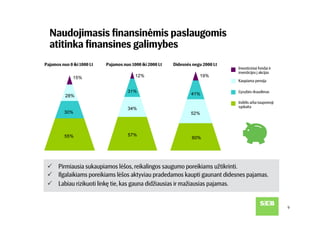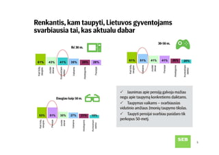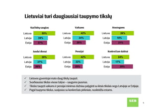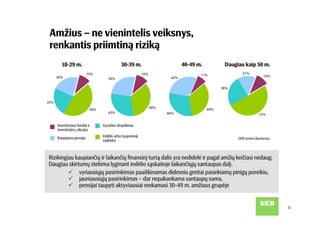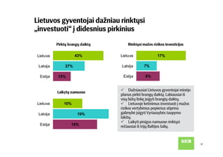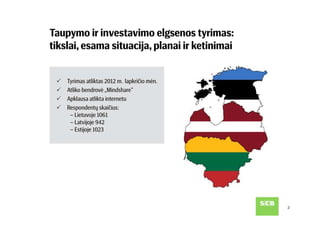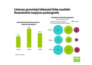 SEB banko užsakymu atlikta Baltijos šalių gyventojų apklausa rodo, kad dažniausiai minimas taupymo tikslas visose šalyse – užsitikrinti saugumą, kurį suteikia turimos santaupos. Vis tik Lietuvos gyventojų taupymo elgsena rodo, kad labiausiai taupoma dabar aktualiems poreikiams, o į tolimą ateitį žiūri pro pirštus. Pasak SEB banko šeimos finansų ekspertės Julitos Varanauskienės, nors lietuviai turi daugiausia taupymo tikslų, taupymo ir investavimo priemonių pasirinkimą riboja finansinės galimybės ir trumpalaikis požiūris į kaupiamą finansinį turtą.