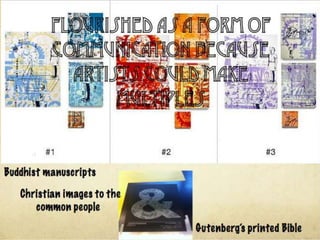 This document lists 12 image credit URLs from various websites providing photographs and information about art history, printmaking techniques, and specific artists. It includes Flickr photo URLs and links to blogs and articles about prehistoric art, Leonardo Da Vinci's landscapes, printmaking history and techniques, and Chinese and Japanese artworks.
