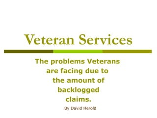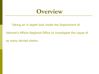 The document discusses problems with backlogged claims at the Department of Veterans Affairs (VA) regional offices. It notes high denial error rates have led to increased backlogs since 2012. The strategic option proposed is to cross-train VA employees with accredited service officers who submit claims, to improve accuracy and efficiency. Benefits include faster claims processing, fewer backlogs and denials, and veterans receiving deserved compensation sooner. Risks include potential slowdowns during cross-training implementation. The recommendation is to proceed with cross-training incrementally to avoid productivity issues.