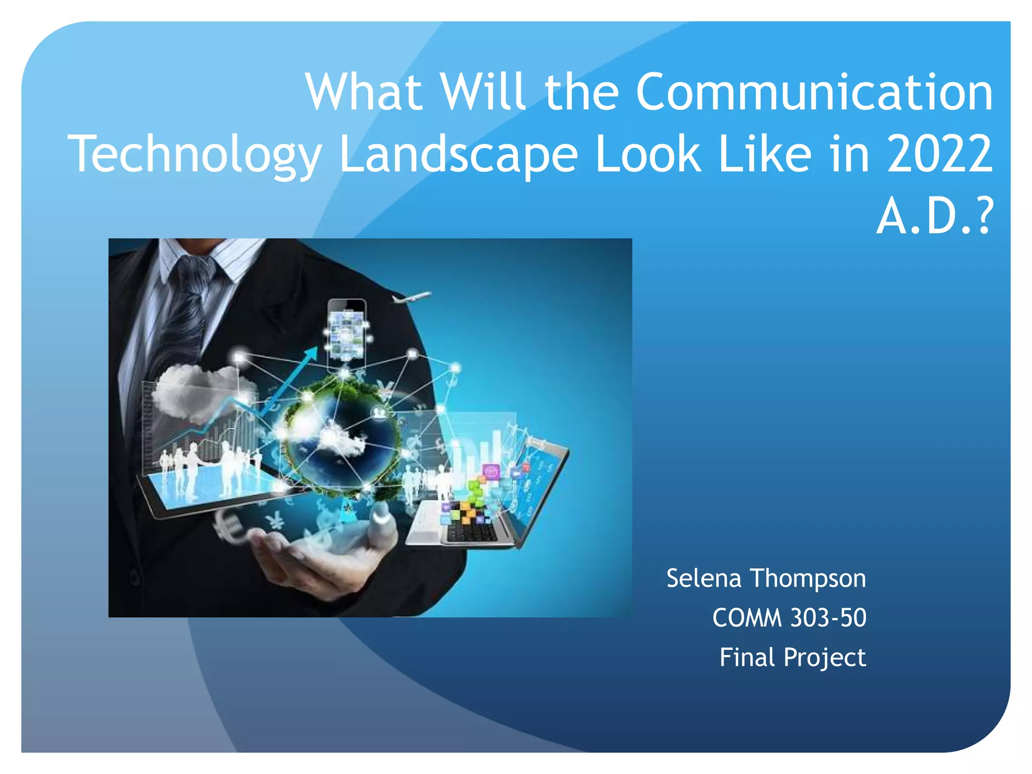 This document discusses predictions for communication technology in 2022. It describes how technology has advanced rapidly over the past decade and will continue to do so. Smartphones are predicted to have voice and facial recognition security, 3D video calling, and over 3 million apps. Education will transition to digital textbooks and lectures on tablets. Television will allow 3D streaming at home. The diffusion of innovations theory helps explain how new technologies spread among users over time.