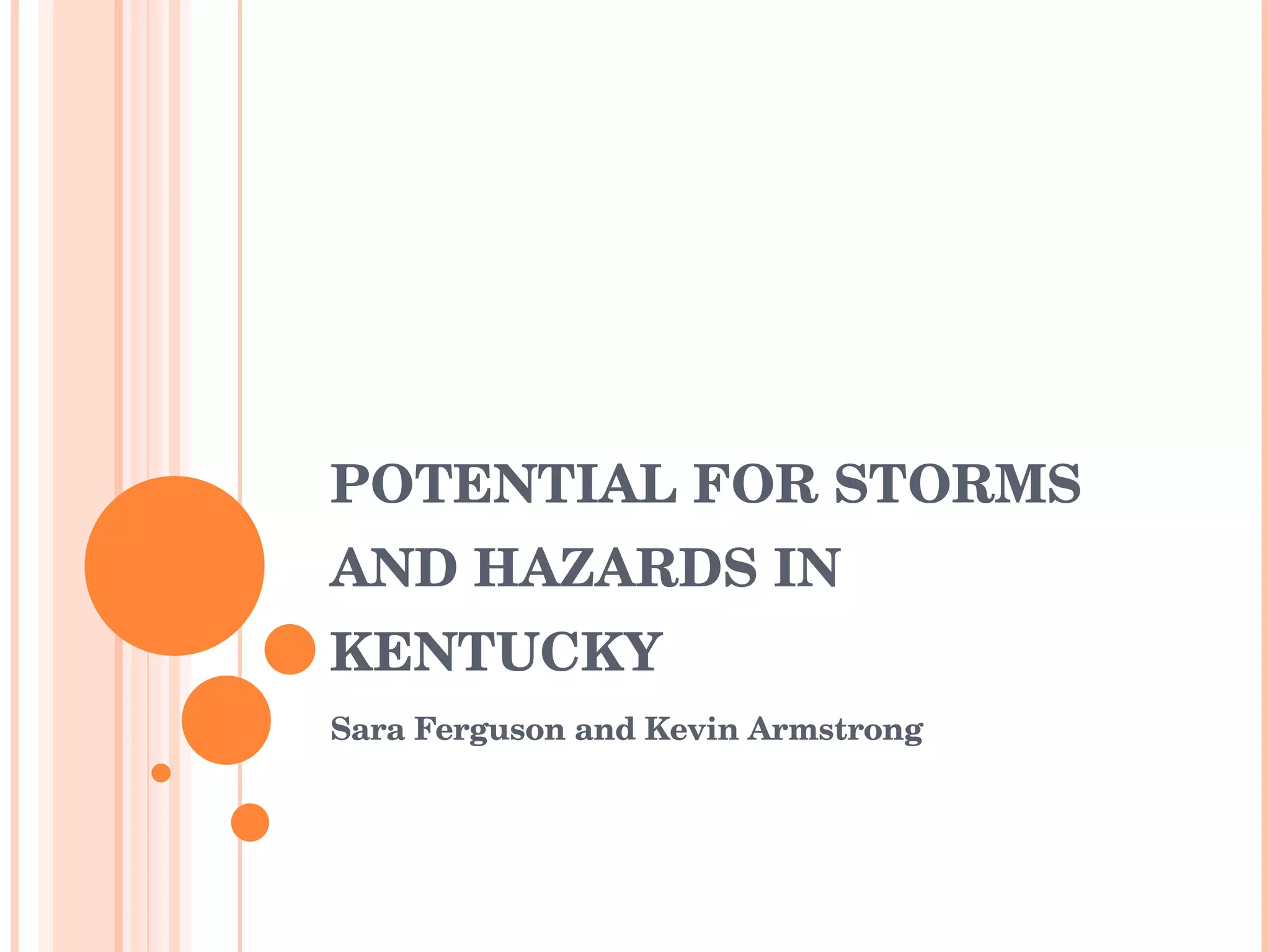 Floods, tornados, and drought are among the major hazards facing Kentucky according to the document. Floods are the most common hazard, especially in eastern areas near mountains. Precipitation is predicted to increase by up to 50% in some seasons according to climate models, exacerbating flood risks. Tornados can occur anywhere in the state and have been increasing in frequency and damage amounts. Drought is also a risk, as less precipitation would reduce water supplies from reservoirs, particularly impacting Lexington and Franklin. Hurricane remnants can cause heavy rainfall and potential flooding. Winter storms and forest fires pose lesser risks but could increase with climate change. Sinkholes resulting from karst geology and erosion from flooding and mudslides also