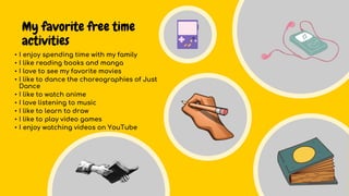 This document contains information about Vanessa Santos Cárdenas' favorite free time activities, activities she does not like, activities that are similar and different between Mexicans and Americans, and her weekly schedule of activities. Her favorite activities include spending time with family, reading books and manga, dancing to Just Dance, watching anime, listening to music, learning to draw, and playing video games. She does not like people making fun of others, watching TV all day, people screaming, big parties, or littering. Similar activities between Mexicans and Americans include using cell phones, listening to music, going out with friends, playing video games, and doing homework. Differences include Mexicans spending more time with family, wearing uniforms to school