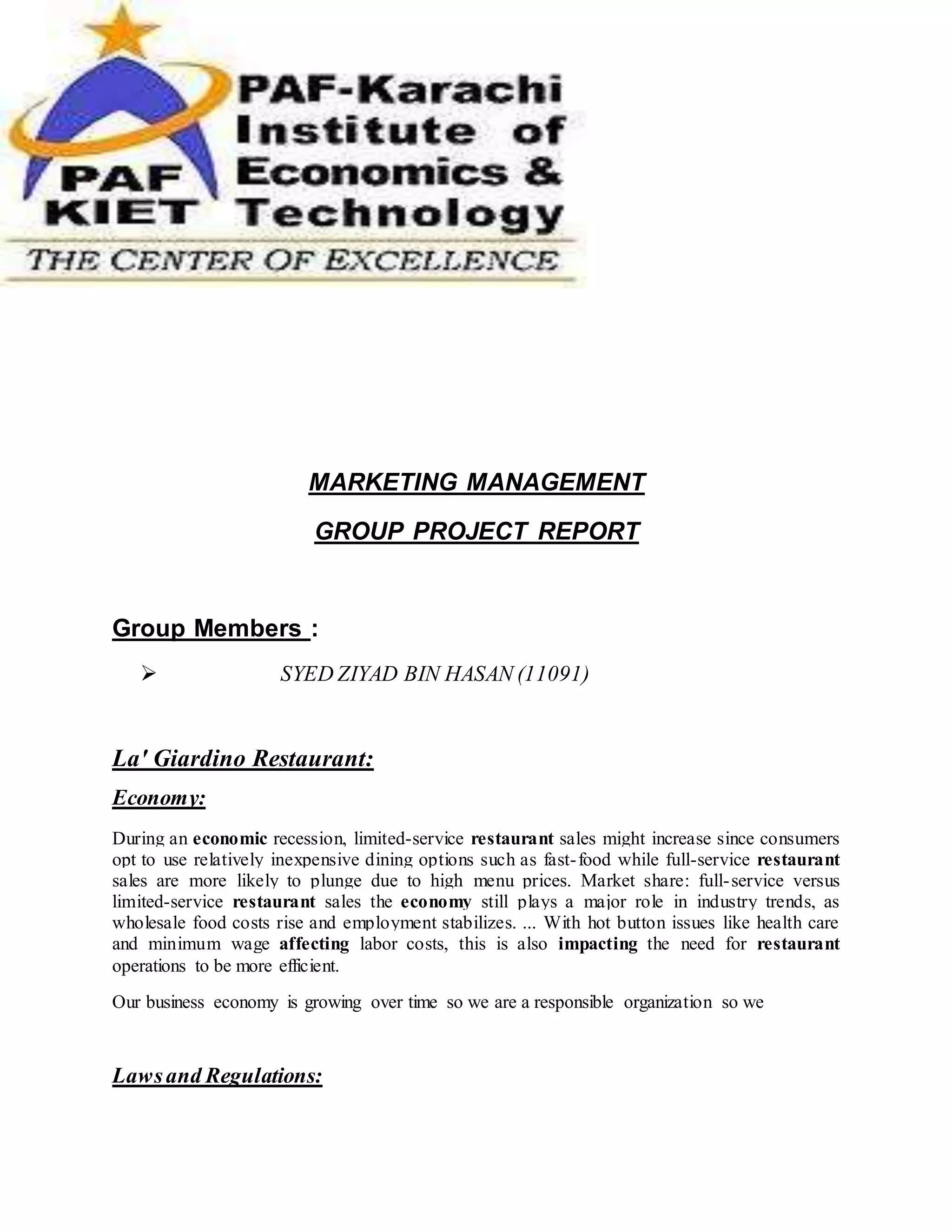 This document provides a group project report for a marketing management course. It includes an analysis of the restaurant industry covering topics such as the economy, laws and regulations, costs, competition, and technology. It then presents the group's proposed restaurant concept called La' Giardino, including its mission statement, SWOT analysis, target market, marketing goals, and marketing mix strategies. The key details are that the group proposes an Italian garden-themed restaurant targeting upper and middle-income families in the Shahrai Faisal area of Karachi, Pakistan with competitive pricing and a focus on fresh, healthy foods.