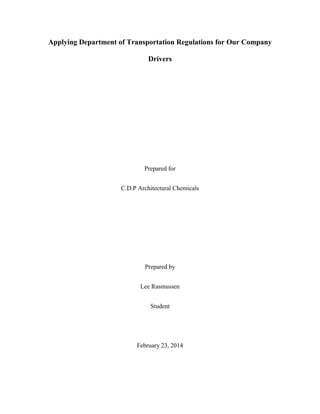 The document proposes applying Department of Transportation regulations to the company's drivers. It finds that the company's trucks are often overloaded due to high delivery weights. It recommends training current drivers for commercial driver's licenses and hazardous material endorsements, leasing new trucks rated for higher payloads, and having managers inspect loads. This would help ensure legal and safe transport while reducing risks of accidents, fines and liability.