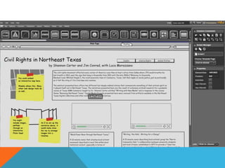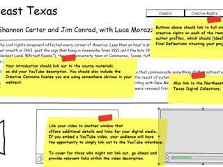 This document outlines the requirements for a final project in an English course on writing with new media. Students must create a website that communicates some aspect of life in Northeast Texas. The website must include an overview, one or more revised texts incorporating multimedia elements and archival materials, credits and information on copyright for all sources, a brief author profile, and optional additional materials. Students can work individually or collaboratively. The project will be completed in stages with deadlines for an overview, wireframe, revision plan, and final website.