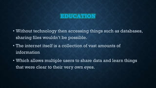 Technology has had a major impact on education by allowing access to vast amounts of shared information and enabling distance learning. It also supports roles in universities, schools, and other education systems through tools like projectors and whiteboards. However, social media in particular has both positive and negative effects by helping people connect but also enabling inappropriate behavior and negative situations. New communication technologies beyond phones now allow video chatting on computers and laptops. Healthcare has benefited from new information available online but must be carefully researched, as some seek to take advantage of those without knowledge. Relationships are also impacted as online dating sites help people meet but also enable deception.