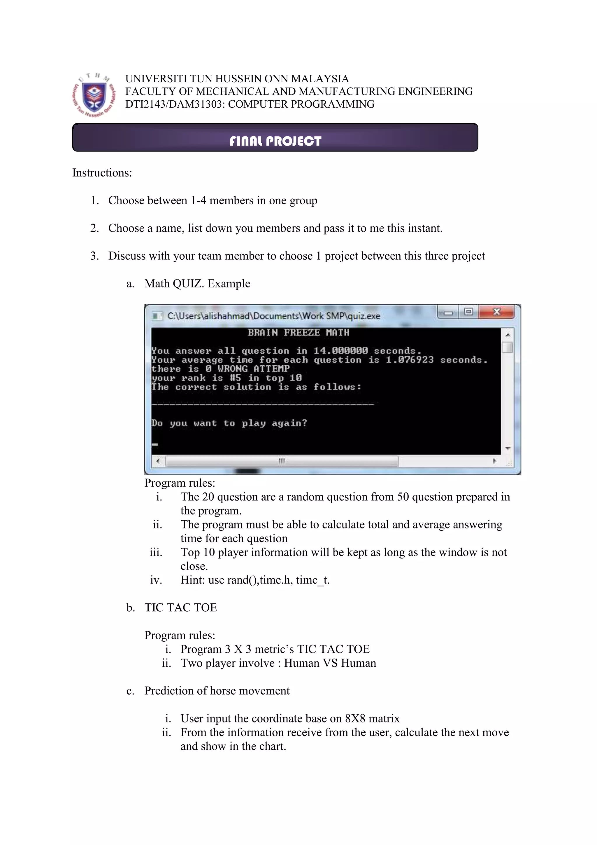 1) The document provides instructions for a final programming project for a computer programming class, broken into 3 potential projects: a math quiz game, tic tac toe game, or a horse movement prediction program. 2) Students are instructed to form groups of 1-4 members, choose a project, and provide their group name and members to the instructor. 3) For the math quiz project, the program will randomly select questions from a pool of 50 and track individual question times and overall times, saving top 10 player data between runs.