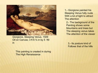 - Giorgione's Sleeping Venus from 1509 set trends for relaxed poses and natural settings that were followed by later works.