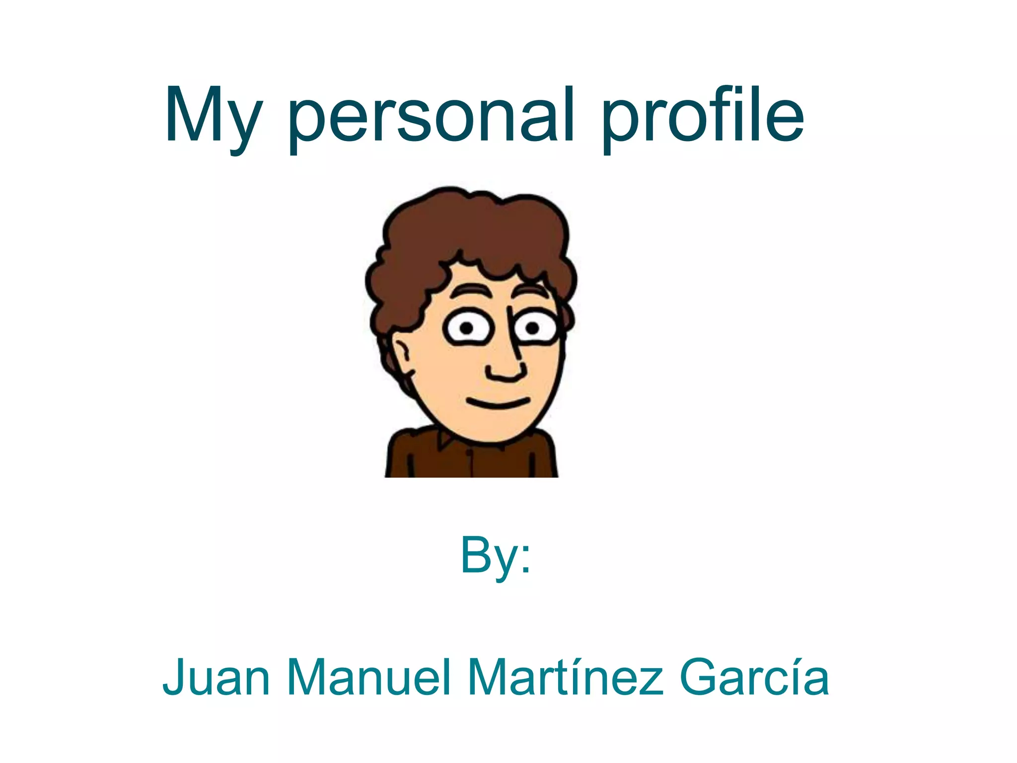 This document is Juan Manuel Martínez García's personal profile. It introduces himself as a 22-year-old student from Pereira, Colombia studying English who lives with his grandmother and uncle. The profile includes pictures and descriptions of Juan playing with his dog, eating bandeja paisa with his parents, and playing video games. It also outlines places he has traveled in Colombia and his future plans to obtain a master's degree, travel abroad, and buy a house.