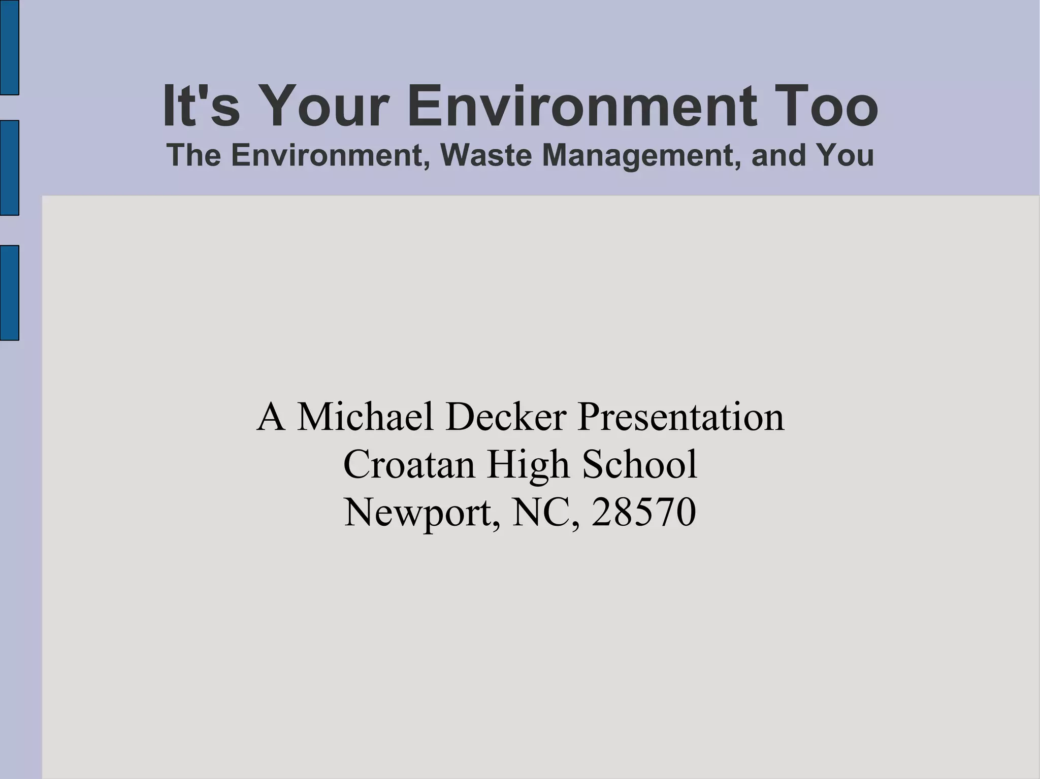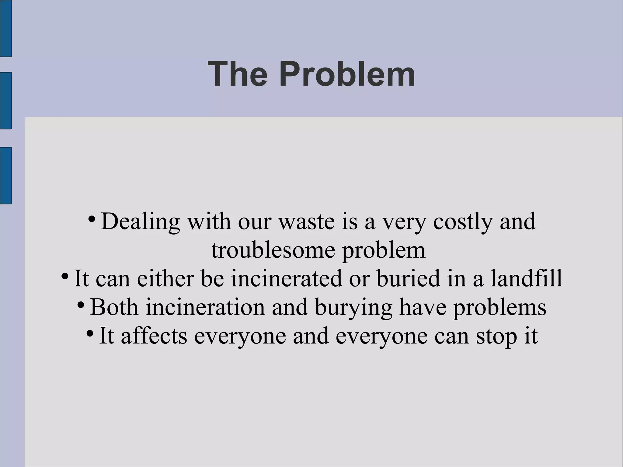 Waste management has become a global problem as the world has become more interconnected through globalization. Dealing with waste through landfilling and incineration can pollute the air, water, and soil and negatively impact communities far from the source of the pollution. Individual actions like reducing consumption and recycling can help curb waste and pollution. Government policies and pressure on companies to reduce waste are also needed to create more sustainable waste management systems.