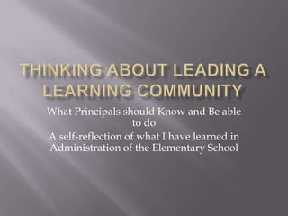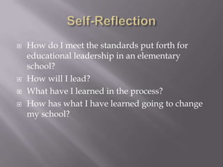 This document discusses the role and responsibilities of an elementary school principal. It reflects on standards for educational leadership and what has been learned through the process. The principal must lead a learning community focused on student achievement. Key responsibilities include articulating a clear vision, setting high expectations, ensuring opportunities to learn, monitoring curriculum and instruction, and creating a culture of continuous learning among teachers. The reflection indicates the principal believes these things but acknowledges they have had limited opportunities to fully implement them in their current role.