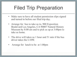 This document outlines the plans and preparations for a 4th grade field trip to the Natural History Museum in Los Angeles to learn about mammals. It details arranging transportation by bus, having permission slips signed, and packing lunches. It provides an itinerary of the mammal halls to visit, discusses pre-trip activities to define vocabulary and compare African and North American mammals. Rules and expectations are outlined for the field trip. Post-trip, students will write a paragraph about what they learned and discuss in groups if they saw the mammal their group presented on.