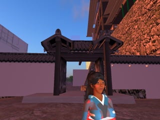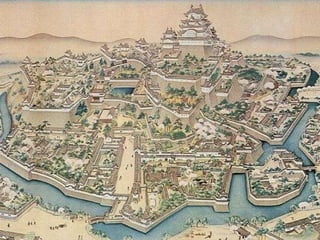 The document provides an architectural description of the reconstruction of Himeji Castle in Second Life. It summarizes the key defensive design features of the original Tenshukaku keep, including intricate internal paths to confuse invaders, hidden entrances, and extra concealed floors for important figures. The reconstruction aims to faithfully recreate these defensive characteristics at a 1:1 scale while also capturing the castle's aesthetic beauty and balance of textures between rooftops and smooth white plaster walls.