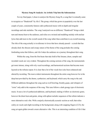 The analysis of 'deadcrush' by alt-j explores the song's complex structure, genre-blending qualities, and thematic depth, highlighting its dark and hypnotic atmosphere. It emphasizes the song's combination of electronic and alternative rock elements, as well as the layered instrumentals and altered vocals that create a unique listening experience. The analysis concludes that the track exemplifies the exploration of music as an art form that draws audiences deeply into the subconscious.