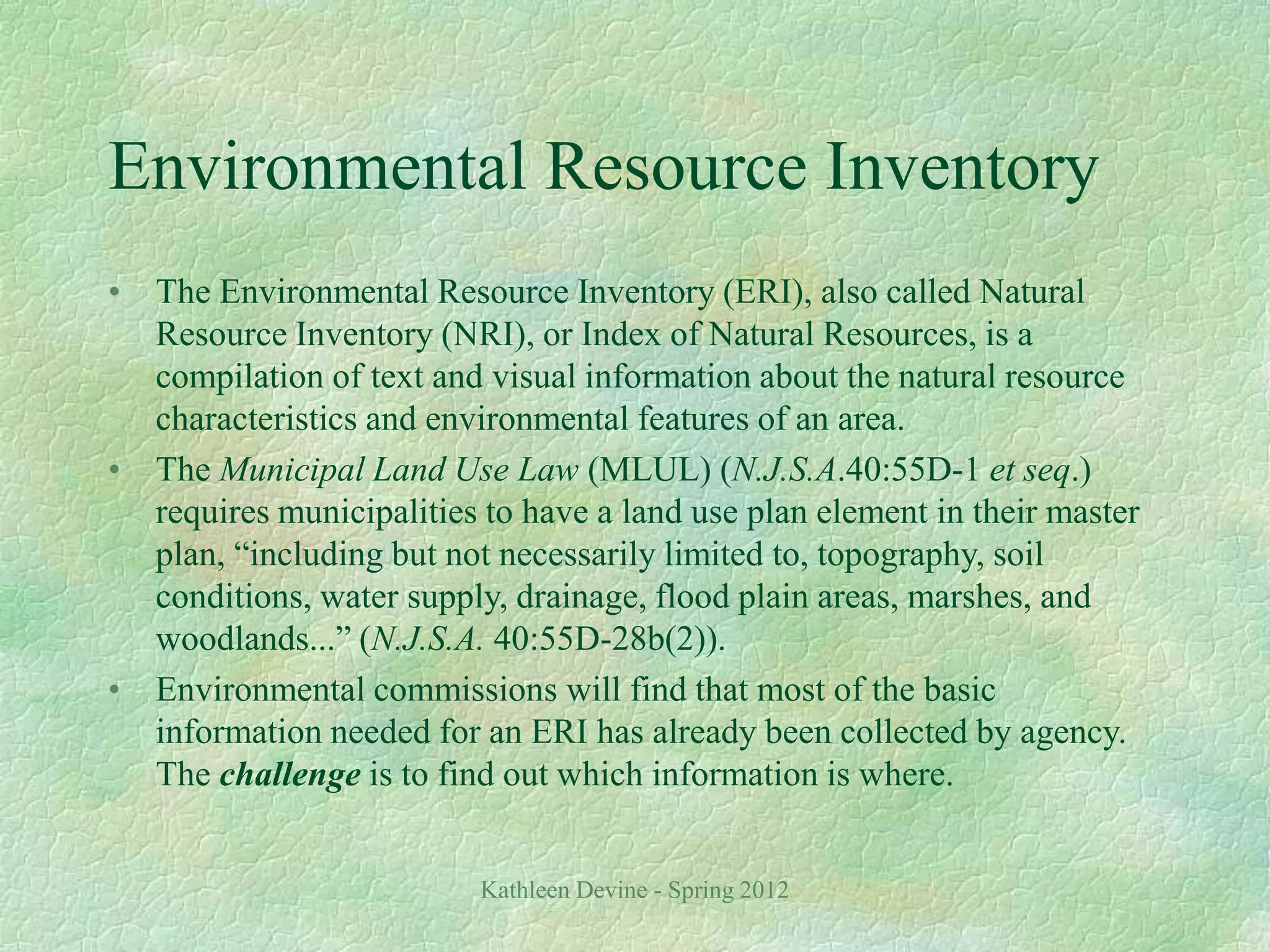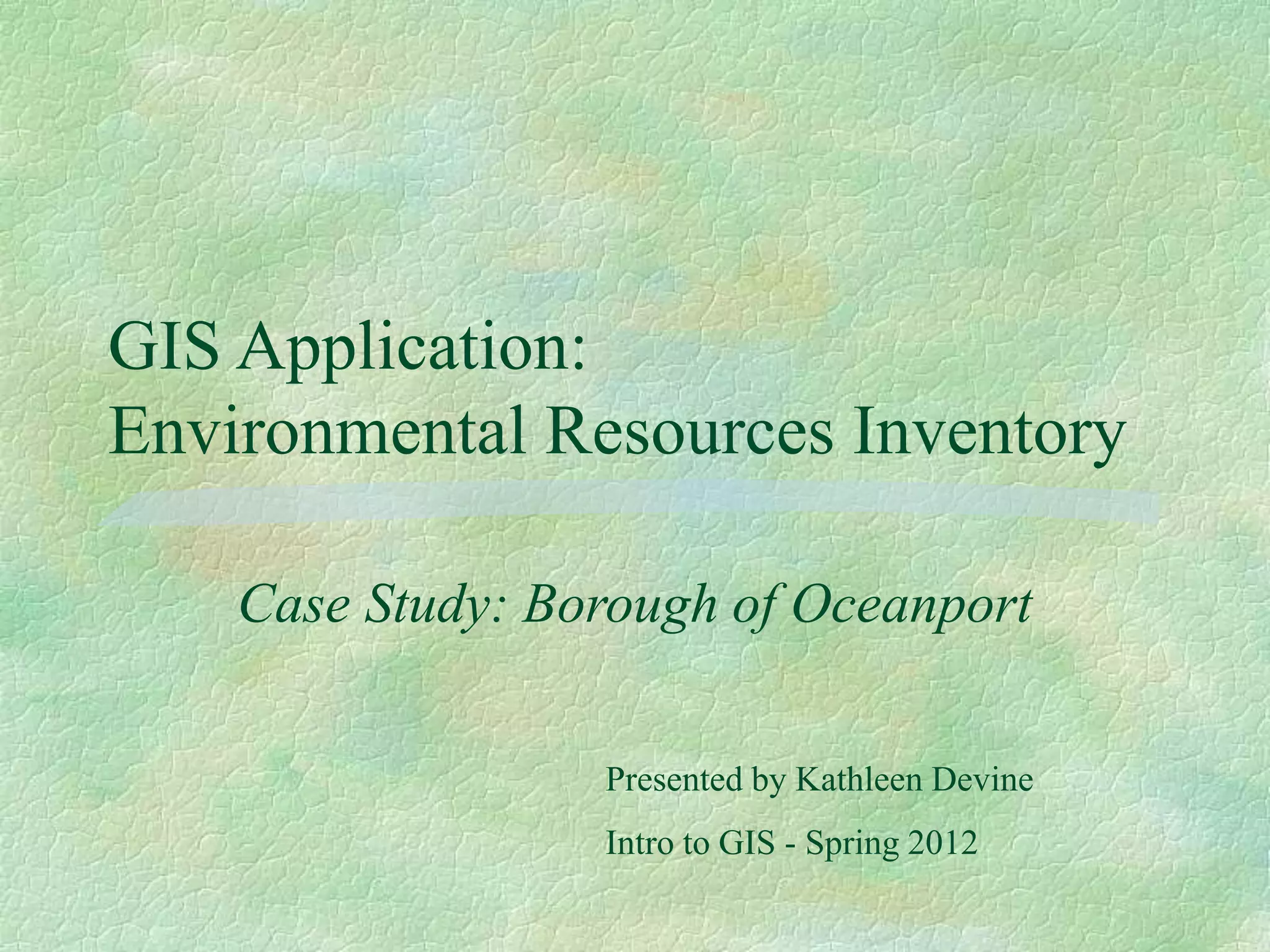 The document summarizes an environmental resource inventory (ERI) created by the Oceanport Environmental Commission in GIS format. It includes base maps of Oceanport along with maps of geology, watersheds, land cover, forests, and habitats. It also identifies some proposed projects like a community forest management plan and expanding safe walking paths. The ERI was created using existing data from NJDEP and the county to compile required natural resource information for the municipality's master plan as mandated by law.