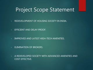 The document outlines a plan to redevelop a housing society in India with the following key points: