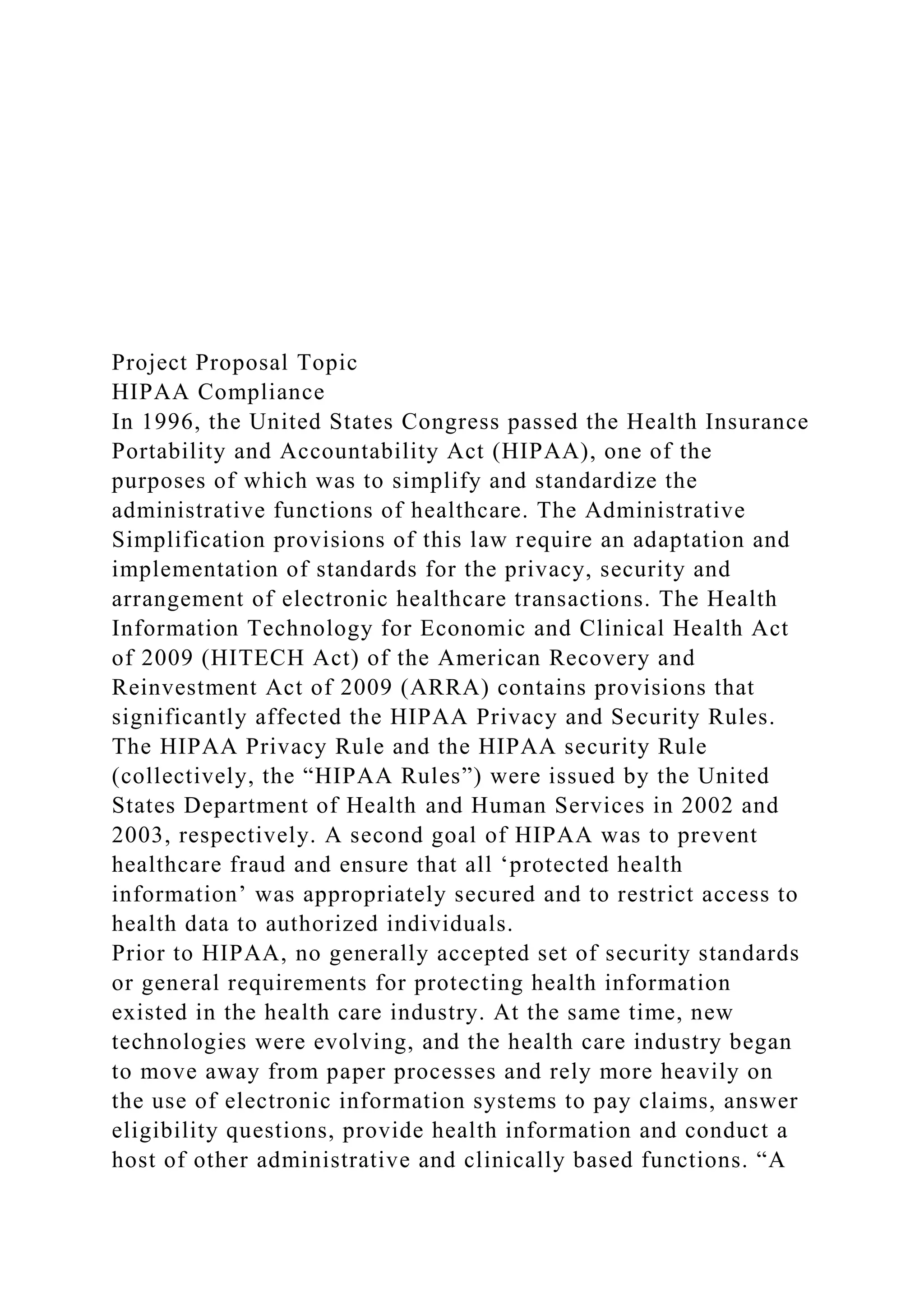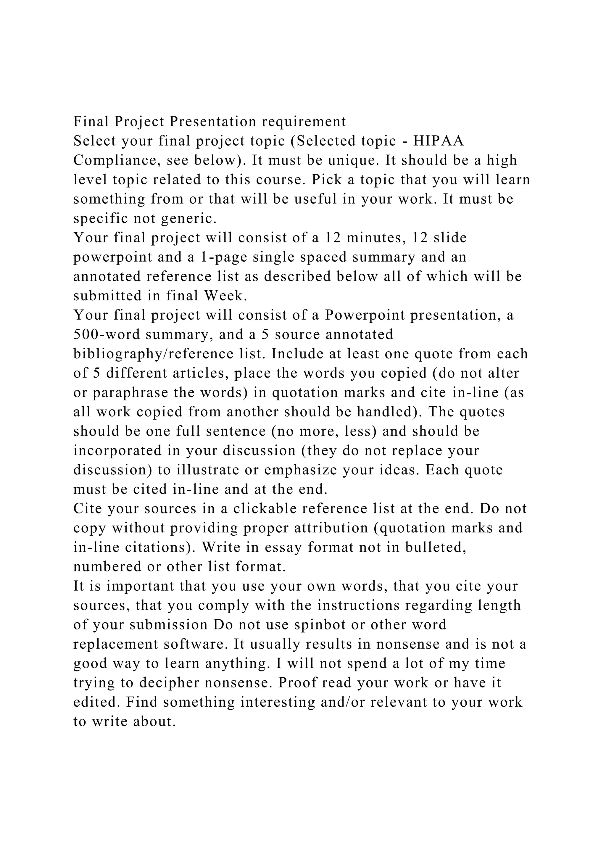The final project requires a unique high-level topic related to HIPAA compliance, consisting of a 12-slide PowerPoint presentation, a 500-word summary, and a 5-source annotated bibliography. The project emphasizes the need for proper citation of sources, incorporation of direct quotes, and original writing. It also outlines the historical context and evolving nature of HIPAA regulations aimed at securing protected health information and ensuring compliance through regular audits.