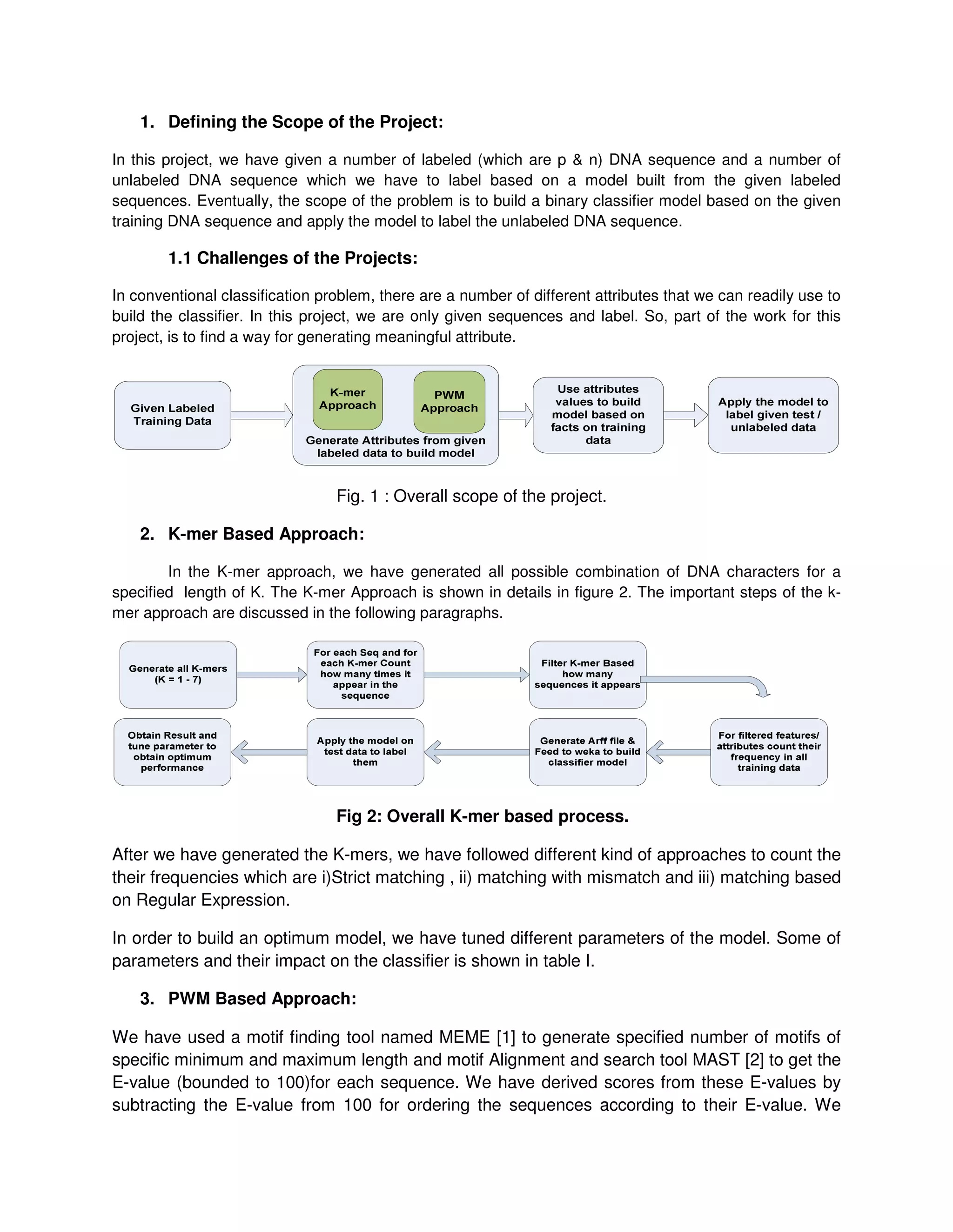 This project aims to build a binary classifier model to label unlabeled DNA sequences as either positive (p) or negative (n) based on labeled training sequences. The team will take two approaches: 1) A k-mer approach that generates all DNA sequence fragments of length K and counts frequencies to use as attributes for classification models. 2) A PWM approach that uses motif finding tools to generate position weight matrices and score sequences to use as attributes. The approaches will be evaluated individually and combined to obtain the best performing model. Key challenges include deriving meaningful attributes from the sequence data alone. Parameters like k-mer length, number of motifs, and motif lengths will be tuned to optimize model performance.