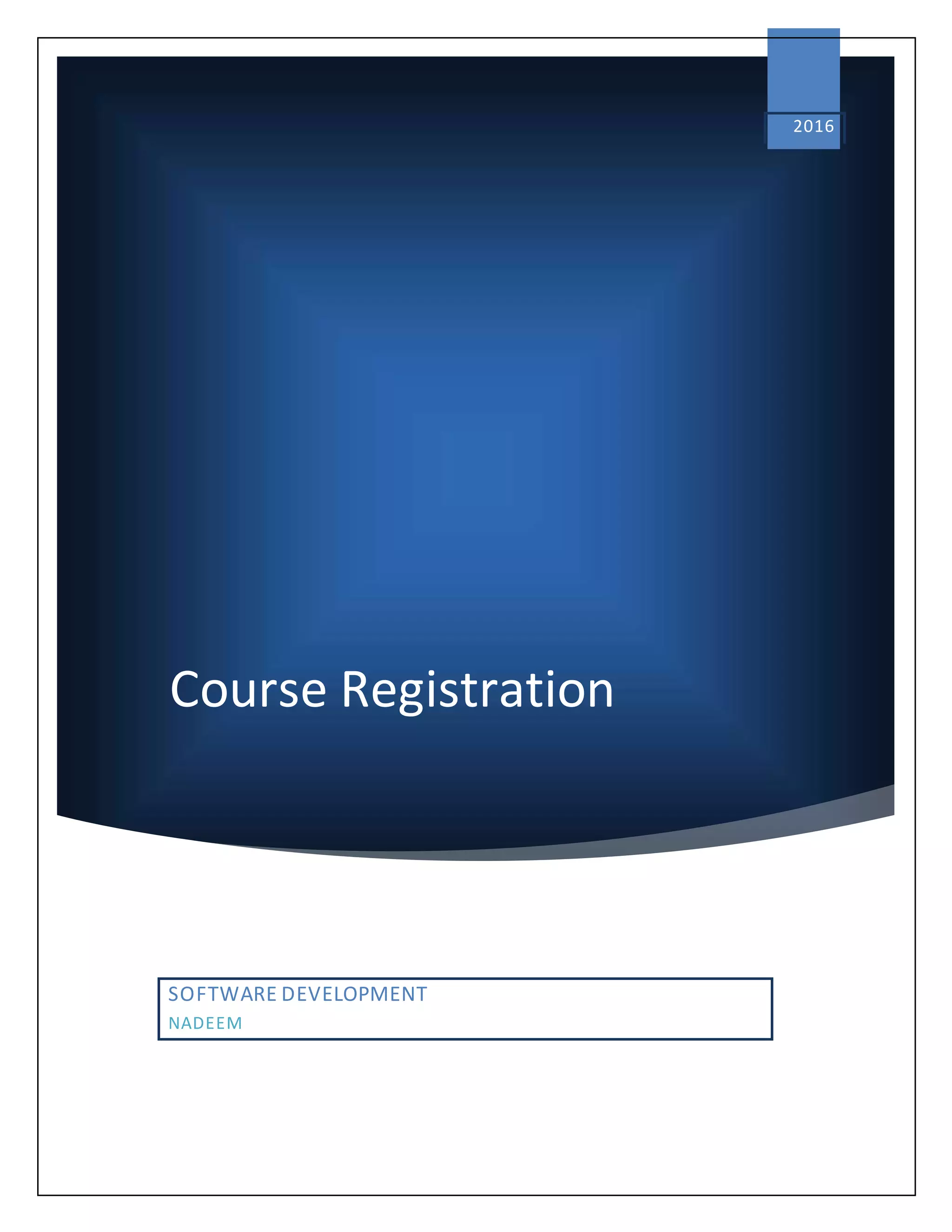 The document provides details of a course registration system project for a university. It includes a project plan with objectives to create an online system to replace the manual paper-based registration currently used. It outlines requirements for the system including functional requirements for student, administrator, teacher and registrar modules. Non-functional requirements around performance, safety and security are also specified. The project will follow a waterfall model for development.