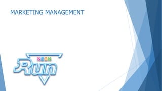 This document provides details on planning and marketing for a night run event called Neon Run in Thailand. It discusses segments of the target market for the event, which is young adults and adults aged 15-35 in Bangkok interested in outdoor activities. Marketing strategies aim to build brand awareness and attract 10,000 runners and over 15 sponsors for the first season. The event will feature a 5 km night run through stations with highlights and activations, followed by a concert with visuals, lights and music. The goal is to position Neon Run as the leading nightlife running event in Thailand through differentiation based on its combination of running, music and neon colors.