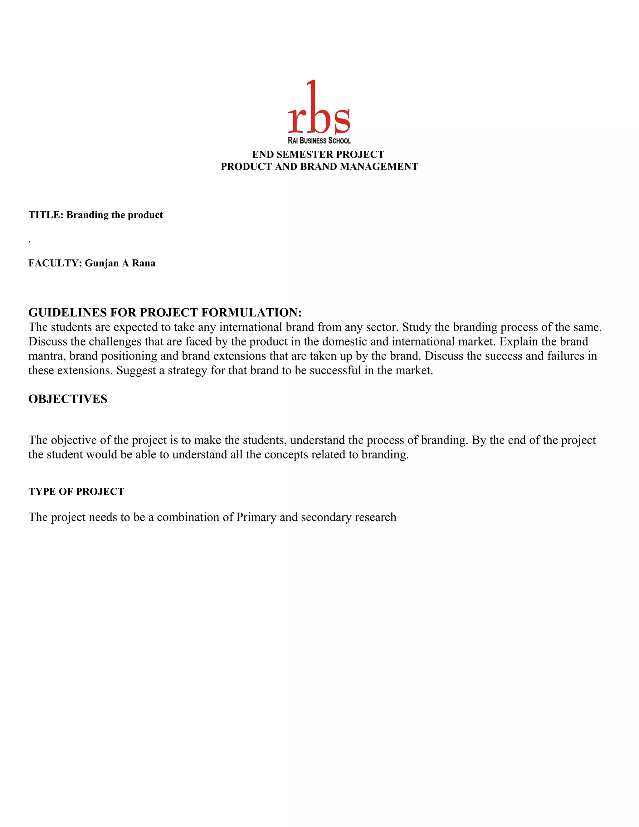 The objective of the project is to make the students, understand the process of branding. By the end of the project