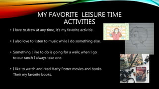 Cinthia enjoys drawing, listening to music, and going for walks. She likes Harry Potter books and movies. While some activities like going to the movies are more fun with friends, she also enjoys helping with field work. Mexican and American teenagers share interests like video games and movies, though Mexican teens prefer family activities and dancing while American teens socialize with friends more. Cinthia's weekly schedule includes time for school, homework, family, and free time.