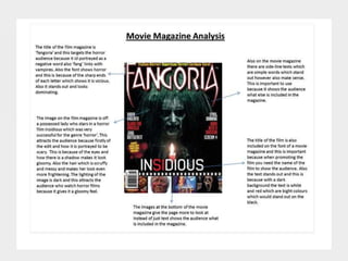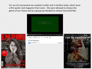 The document summarizes how the media product of a trailer, magazine cover, and film poster for a horror/thriller genre film challenge and develop conventions of real media. For the trailer, conventions like camera shots, editing, sound, characters, and locations were followed, but some elements like character outcomes were challenged. The magazine cover followed conventions like layout, masthead, and image placement, but challenged elements like text placement. The poster followed conventions like a close-up image and capital title, but challenged conventions like title placement. Overall, the media product used research of real examples to both develop and challenge typical genre conventions.