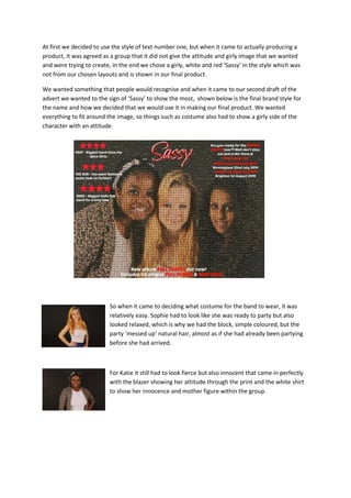 The document discusses the design process for ancillary materials for a girl band music project. It describes choosing a girly yet individual style with white, red, and black colors. Different text styles were prototyped before settling on a girly cursive style to match the desired image. Feedback led to changing the advertisement to be less girly with a modern white, black, and gray color scheme. The CD cover was also adjusted based on feedback to focus more on showcasing the band and individual band members rather than a single music video. The end result was meant to create a cohesive branding identity across all ancillary materials that would appeal to their target audience of young girls.