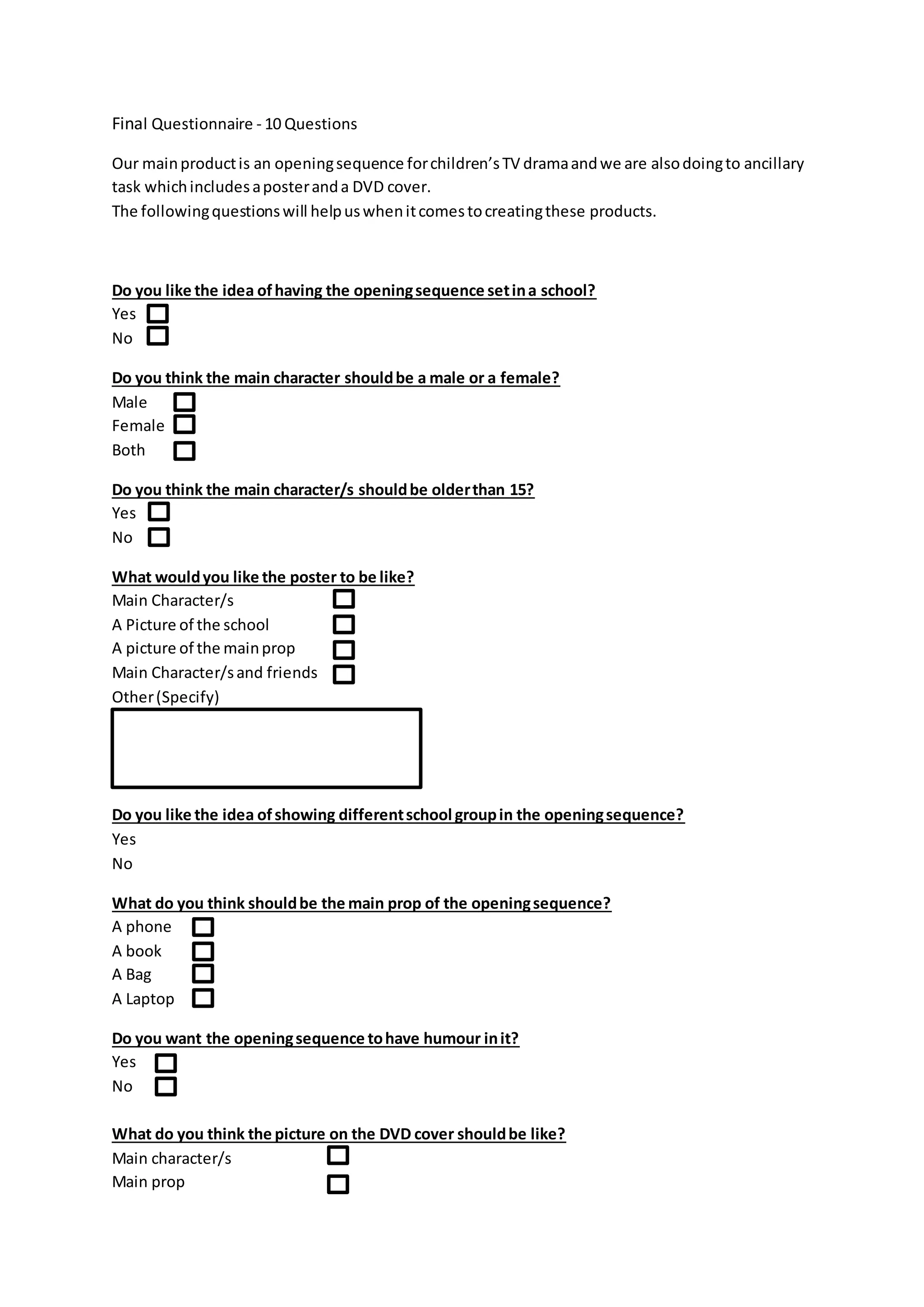 This document contains a 10 question survey about creating opening sequences, posters, and DVD covers for a children's TV drama. The questions ask about setting the opening sequence in a school, the gender of the main character, their age, what should be featured on the poster and DVD cover, what the main prop should be, whether there should be humor, and color schemes for the poster and if it should match the DVD cover. The document aims to gather input that will help in creating these products for the children's TV drama.