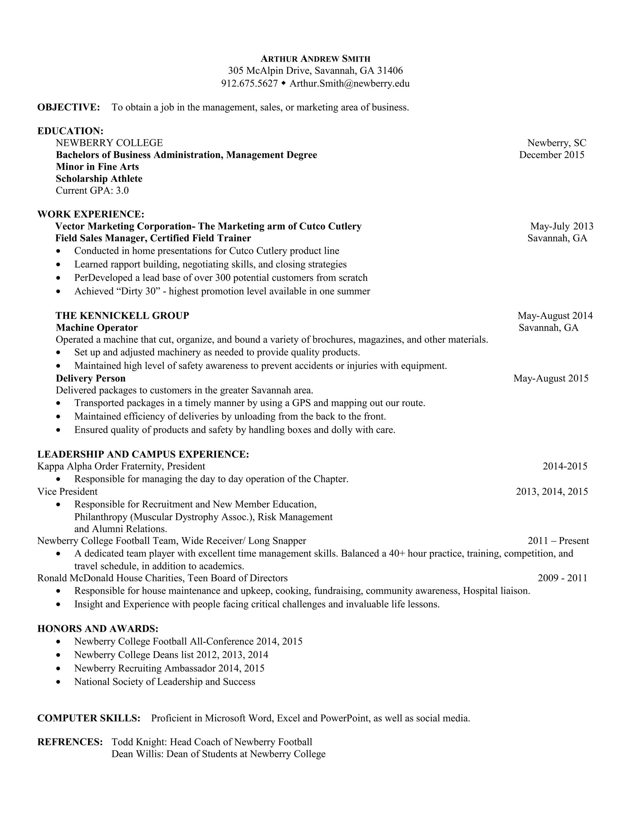 Arthur Smith is seeking a job in management, sales, or marketing. He has a Bachelor's degree in Business Administration from Newberry College and experience in sales, machine operation, and delivery. At Newberry, he was president of Kappa Alpha fraternity and played football while maintaining good grades.