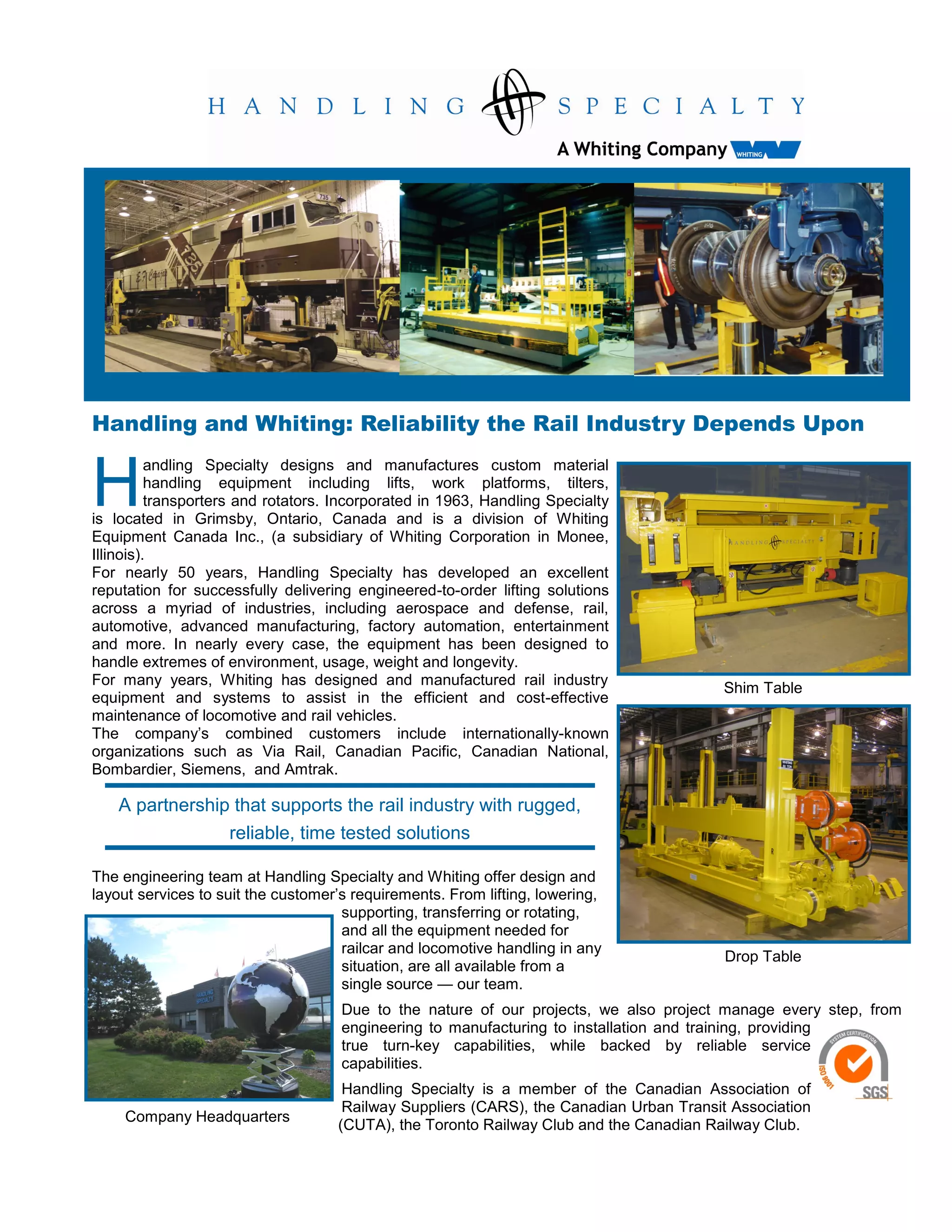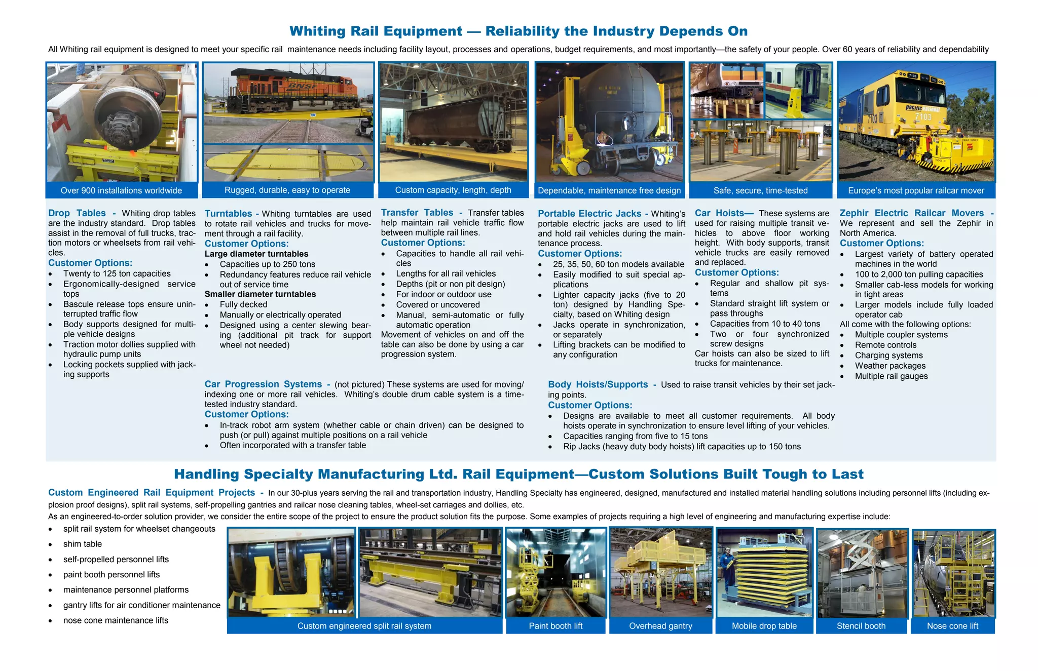 Handling Specialty designs and manufactures custom material handling equipment for industries such as rail, aerospace, automotive, and manufacturing. It has served the rail industry for over 50 years by developing lifts, tilters, transporters, and other equipment to handle railcars and locomotives. The company works closely with major rail operators in Canada and the U.S. to provide engineered solutions tailored to customers' specific maintenance needs and processes. Handling Specialty prioritizes safety, reliability, and customer service in its custom material handling systems.
