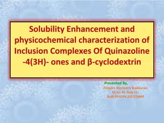The document discusses the solubility enhancement and physicochemical characterization of inclusion complexes formed between quinazoline-4(3H)-ones and β-cyclodextrin. It outlines various methodologies for complex preparation, such as physical mixing and kneading, and characterizes the complexes using spectroscopic techniques. The study concludes that the kneading method is the most efficient for enhancing the solubility of the compounds in water.