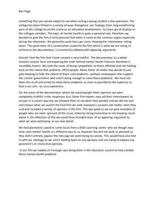 This document summarizes the approach taken to create a documentary film about mental health issues among students. It discusses conducting interviews with students, college staff including a psychology teacher and academic coach, and a worker at a local Bible learning center. The goal was to represent different perspectives on mental health issues and the level of support for students. Scenes were filmed on the college campus to establish an education setting and interviews used close camera angles to feel conversational. The film aimed to raise awareness of mental health issues in an honest way without hiding the true impacts or censoring differing opinions.