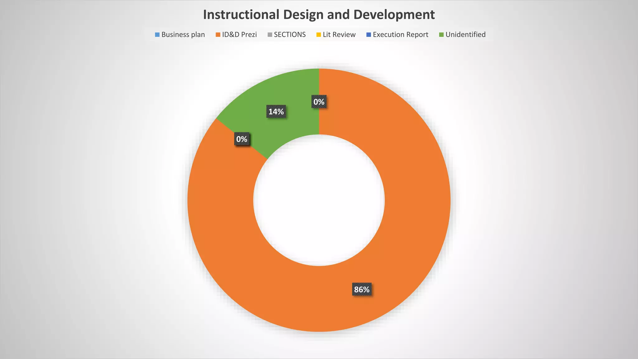 This document contains percentages for different skills across multiple categories. The highest percentages are 78% for problem solving, analysis, and decision making, 86% for instructional design and development, 60% for communication and interpersonal skills, 62% for communication and interpersonal skills, and 55% for research. The skills are broken down further for areas like business plan, ID&D prezi, sections, literature review, and execution report.