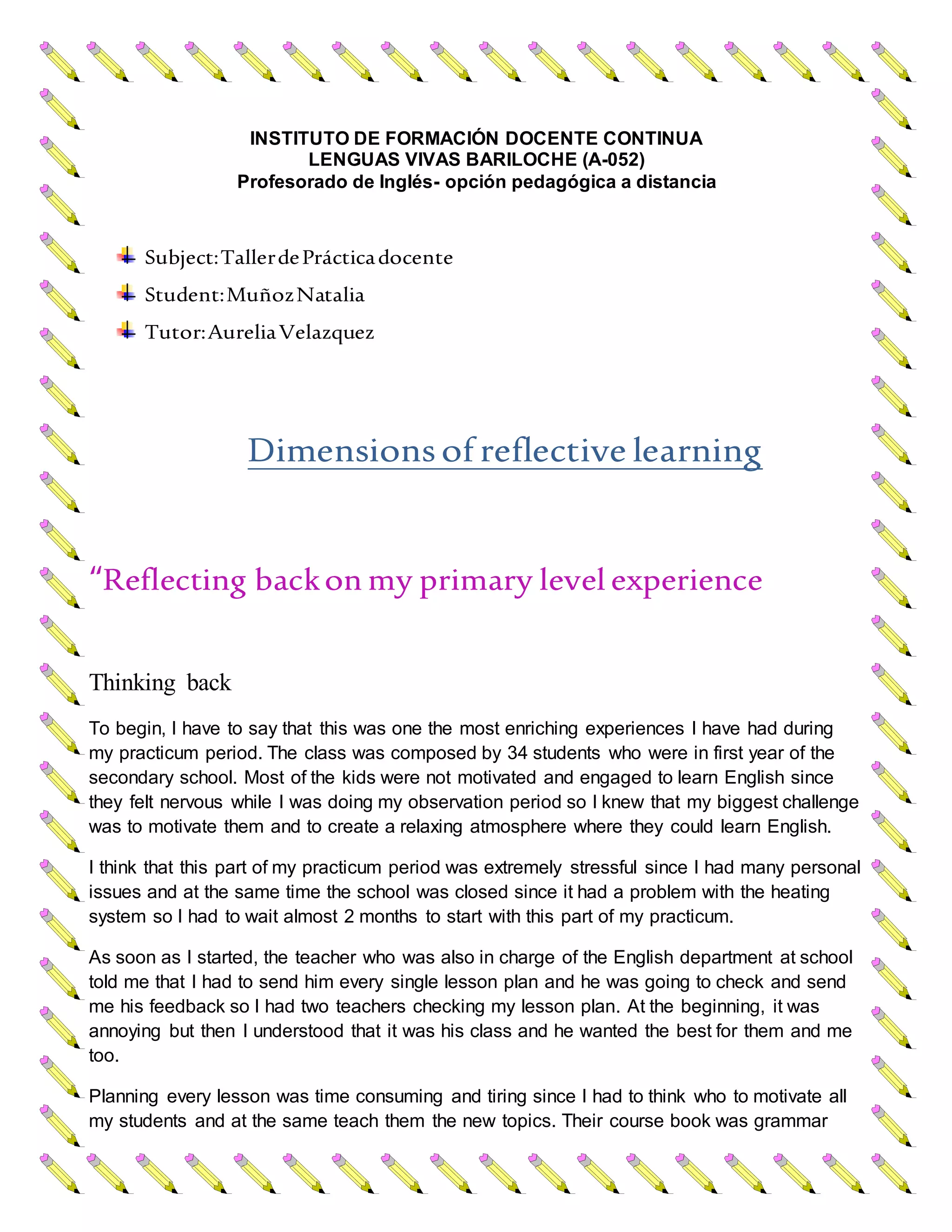 This document summarizes the student's experience completing their teaching practicum with a class of 34 primary school students in Argentina. Some of the key challenges included motivating unengaged students, dealing with personal issues and school closures, and having lesson plans reviewed by two teachers. The student worked to make lessons engaging by including games and speaking English. Over time, student participation improved. The experience helped the student develop strategies for motivating reluctant language learners and improved their confidence in managing a large class.